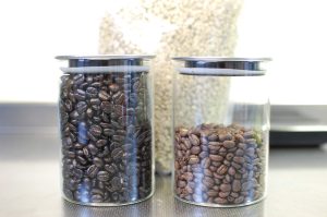 【写真左、通常の生豆・右、カフェインレスの生豆】